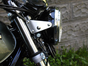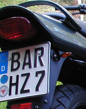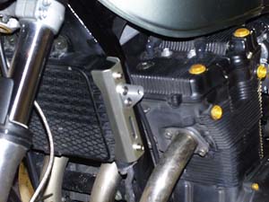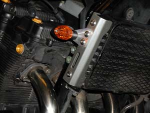 Da mir diese riesen Blinker nicht gefallen konnten, mußte die ab. Ich entschied mich hinten für Kellermannblinker. OK Standartmaßnahme. Vorne Lenkerendblinker oder an die alte Position was anderes kann jeder. Also ab damit in den nicht so Sturzgefährdeten Bereich an den Kühler. Ein paar Halter as Alu-Blech gefertigt und fertig ist die Laube. Die alten Löcher im Lampenhalter ersteinmal mit ein Paar Schloßschraube verschlossen. Später dann das ganze Dreieck gegen eins aus VA ohne Löcher getauscht.