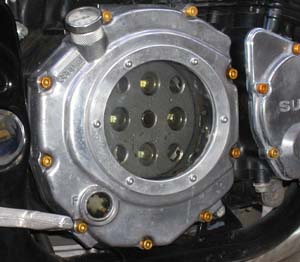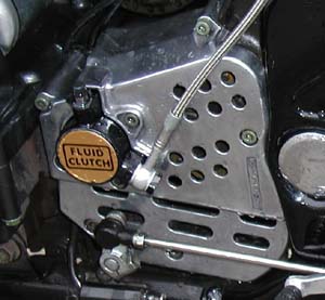 Der Seilzug war mal wieder fest. Also jetzt reicht es mir mit dem doofen Ding. Hydraulik muss her. Nicht lange gesucht und schon war die Lösung da. Man nehme einfach den Geber einer GSXR-W oder Hayabusa und die Ritzelabdeckung einer GSXR-W oder Bandit. Ein paar Anpassungen damit das Teil im Rahmenbereich nicht scheuert. Jetzt noch eine Stahlflexleitung und schon sind wir fertig. Bei der Gelegenheit Hab ich gleich noch den Kupplungsdeckel etwas verändert. Jetzt kann man der Kupplung bei der Arbeit zuschauen. Na ja, eigentlich meist die Anderen.
