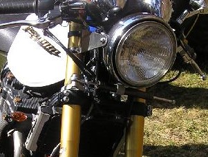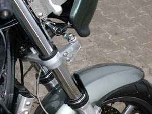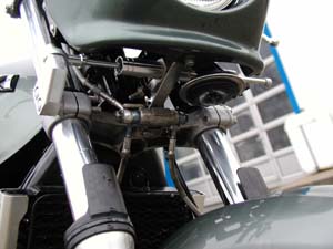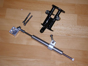 Ja das Thema Lenkungsdämpfer. Meistens brauch man ihn eigentlich nicht. Wenn man ihn denn schon hat , möchte man ihn auch nicht mehr missen. Ich hatte ein rum liegen, und ein Problem am Fahrwerk. Also war das Projekt geboren. Das Problem kam natürlich wo anders her. Nämlich von einem defekten Stoßdämpfer den ich mir dann auf Garantie hab ersetzen lassen. Das Projekt war aber so weit das es beendet werden musste. Lange hab ich nach dem geeigneten Ort für die Unterbringung gesucht. Längst zum Motor schied aus. Sturzbereich. Oben Quer, oder vorm Ölkühler quer schied eben falls aus. Kein Platz. Bild in der Fighters gesehen und ich wusste wo er hingehört. Vor den Lenkkopf. Halterungen für beide Anlenkpunkte wieder einmal selbst gefertigt, da für unsere ja sowieso nichts im Laden gibt. Der eine Teil wird am Lenkkopf angeschraubt. Ähnlich der Moko-Halterung für Lenkerverkleidung. Der zweite an der unteren Gabelbrücke.